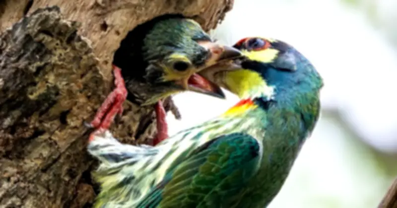 Anh Hùng Phạm chia sẻ rằng, cặp chim cu rốc không đơn thuần chỉ mang thức ăn về tổ. Chúng thể hiện sự phân công vai trò rất rõ ràng để đảm bảo con non luôn được an toàn và nhận đủ dinh dưỡng. Khi một con bay đi kiếm mồi, con còn lại sẽ ở lại gần tổ để canh giữ, tạo nên một hệ thống bảo vệ hiệu quả. Dù không xác định được cụ thể con trống hay con mái là người trực tiếp đút thức ăn, anh Hùng cho biết cả hai thay phiên nhau trong nhiệm vụ chăm sóc này.