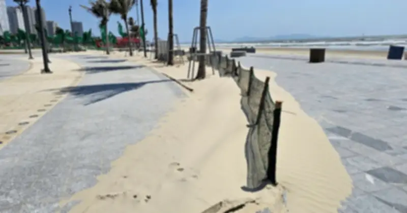 Một lãnh đạo công ty cho biết, từ mùa gió chướng cuối năm 2025, hiện tượng cát bay tràn vào đã xuất hiện. Nguyên nhân được xác định là do cốt nền công viên thấp và thiếu bờ kè cao để chắn cát. Khi trời nắng và gió mạnh, cát dễ dàng xâm nhập vào khu vực này. Để ứng phó, công ty đã triển khai các biện pháp như sử dụng xe cuốc hàng ngày để cào cát từ sát bờ kè ra biển, tưới nước thường xuyên lên bề mặt cát, và giăng 1.000 mét lưới lan cao 0,7 m dọc công viên. Tuy nhiên, các phương pháp này vẫn chưa đủ để ngăn chặn hoàn toàn cát bay sâu vào bên trong.