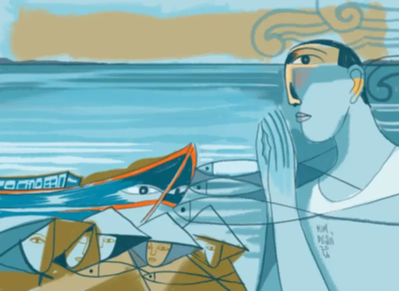 Cha tôi thường thở dài khi nhắc về quá khứ: “Giá trước đây, làng có nhiều đứa có hiếu. Nhiều kẻ chẳng lành lặn vì phạm vào bụng biển”. Những lời đó như xoáy sâu vào lòng tôi, gợi nhớ về Hội cá biển – một sự kiện vui đến xốn xang vào độ cuối xuân đầu hạ. Ngày ấy, cá voi, cá heo từ khắp nơi tụ về, nhảy múa trên sóng như làm xiếc, chào đón người thân và khoe thân thể cường tráng. Dân làng vỗ tay cổ vũ, cả đàn cá hào hứng bơi lượn, tạo thành những dải lụa trên biển.