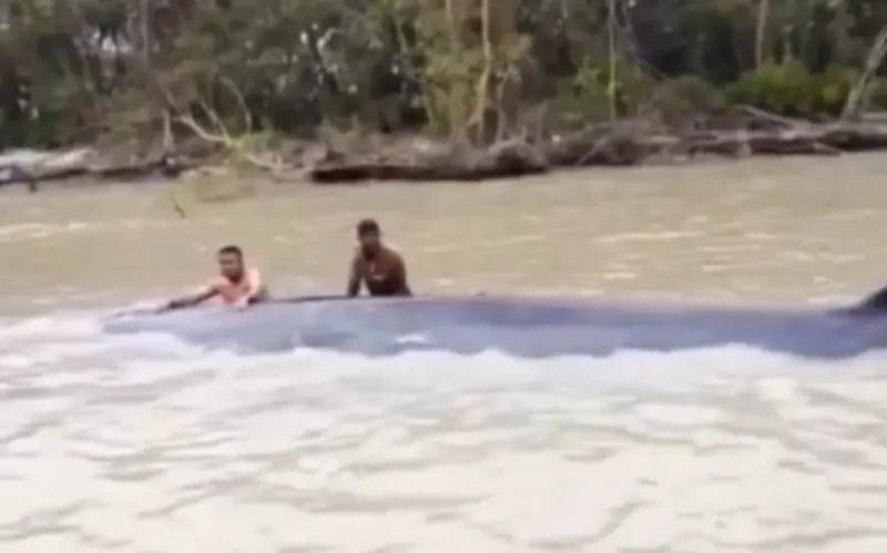 Khi tiến lại gần, họ nhận ra đó là một con cá voi với chiều dài lên đến 15 mét. Do mực nước sông xuống thấp, thân mình của nó không thể di chuyển được, khiến nó bị kẹt lại. Ngay lập tức, một số người đàn ông đã nhảy xuống nước từ thuyền của mình, cố gắng đẩy con cá voi trở lại vùng nước sâu hơn để cứu sống nó.