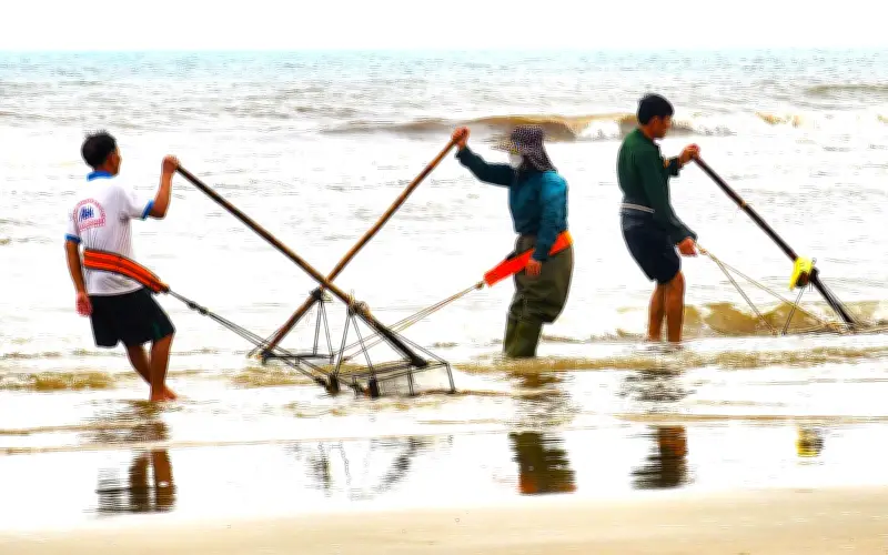 Theo quan sát, người dân thường tập trung thành từng nhóm nhỏ từ 3 đến 5 người, tiến ra khu vực bờ biển có mực nước sâu khoảng 20-50cm. Họ sử dụng các công cụ như có gắn lưới để cào kéo và rê bắt ốc tép một cách hiệu quả. Sau mỗi chuyến cào bắt, lượng ốc tép thu được được thu gom và cho vào bao tải, sau đó xếp lên bờ biển để bán cho các thương lái. Chỉ trong một ngày, tổng lượng ốc tép mà người dân cào bắt được ước tính lên đến hàng chục tấn, cho thấy quy mô đáng kể của hoạt động này.
