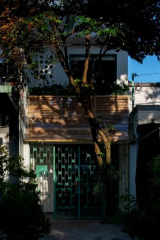 Màu xanh dịu mát bắt đầu từ chiếc cổng sắt được trang trí tinh tế với những bông hoa xen kẽ, nép mình dưới tán cây vú sữa xum xuê. Hàng hiên phía trước, với mái che rộng rãi và những chiếc lu hứng nước mưa, gợi lên hình ảnh quen thuộc của làng quê sông nước miền Tây, nơi con người sống chan hòa với thiên nhiên và gắn bó với xóm giềng.