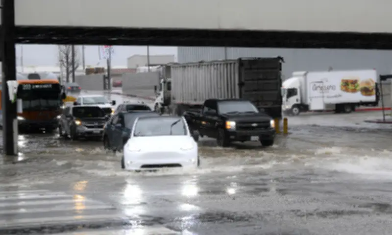 Vào ngày 16/2, nhiều khu vực tại California đã ghi nhận hiện tượng ngập lụt đáng báo động. Thành phố Los Angeles hứng chịu lượng mưa từ 2,5 đến 5 cm, trong khi dải núi ven biển phía bắc Vịnh San Francisco chứng kiến mức mưa cao từ 7,5 đến 12 cm, đây là con số cao nhất từ trước đến nay. Tại khu vực Westwood thuộc Los Angeles, mực nước dâng cao đến ngang thân xe, buộc một số đoạn đường phải đóng cửa do sạt lở đất. Các thành phố Stockton và Modesto cũng báo cáo lượng mưa theo ngày lớn chưa từng có, làm trầm trọng thêm tình hình.