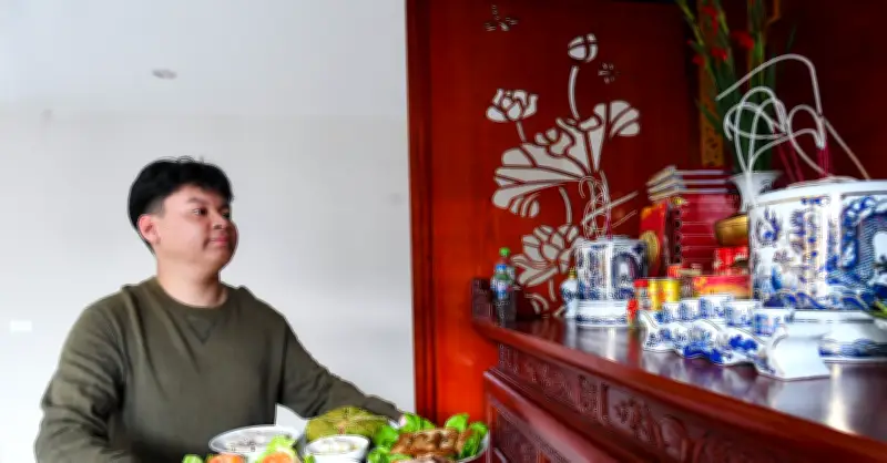 Vào lúc 10 giờ 30 phút trưa ngày 29 Tết Bính Ngọ, mâm cơm cúng đã được bày biện tinh tươm với những món ăn truyền thống như bánh chưng, thịt quay, canh măng... Chàng trai 21 tuổi đã thay một chiếc áo dài tay chỉnh tề, cầm tờ sớ tất niên để khấn mời tổ tiên về ăn Tết cùng gia đình, thể hiện lòng thành kính sâu sắc.