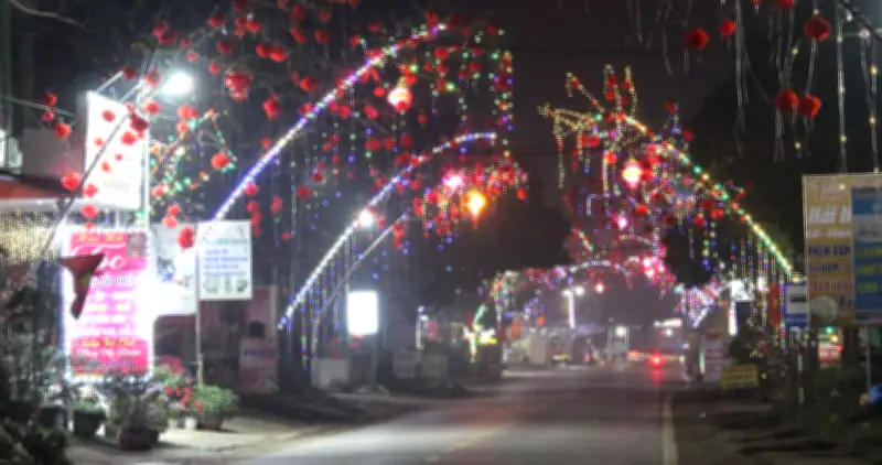 Trong những ngày giáp Tết Nguyên đán, dọc theo tuyến quốc lộ 2, đoạn qua xã Trạm Thản, tỉnh Phú Thọ, một khung cảnh rực rỡ đã thu hút sự chú ý của nhiều người. Ban ngày, những chiếc đèn lồng đỏ thắm được treo lên, còn khi màn đêm buông xuống, ánh sáng từ dây đèn LED bao quanh thân cây nêu tạo nên một không gian lung linh, đầy màu sắc.