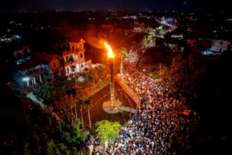 Trong một đêm hội truyền thống đầy sôi động tại thủ đô Hà Nội, một cây đuốc khổng lồ được làm từ tre và nứa với chiều cao ấn tượng hơn 10 mét đã bùng cháy rực rỡ, tạo nên một cảnh tượng ngoạn mục thu hút hàng nghìn người dân và du khách hiếu kỳ. Sự kiện này không chỉ là một phần quan trọng của lễ hội mà còn thể hiện sự gìn giữ và phát huy những nét văn hóa đặc sắc của người Việt Nam qua nhiều thế hệ.