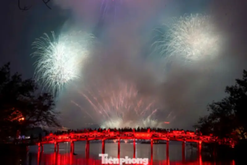 Đúng thời khắc giao thừa, những chùm pháo hoa đầu tiên đã bừng sáng trên bầu trời Hà Nội, tỏa ra nhiều tầng màu sắc rực rỡ như đỏ, vàng, xanh, tím. Màn trình diễn kéo dài trong khoảng 15 phút, với ánh sáng pháo hoa phản chiếu xuống mặt nước hồ Hoàn Kiếm, tạo nên hiệu ứng lung linh, huyền ảo. Khu vực cầu Thê Húc nổi bật giữa nền trời rực rỡ, trở thành điểm nhấn thu hút mọi ánh nhìn.