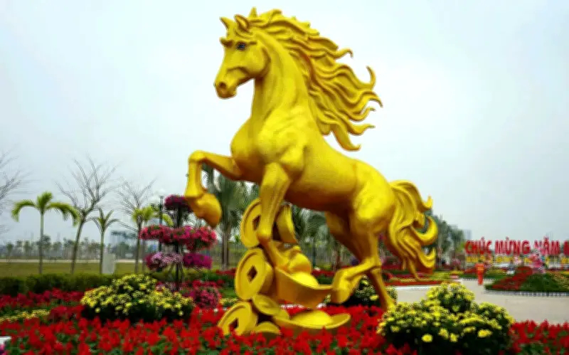 Trung tâm của vườn hoa là một tạo hình linh vật ngựa vàng đang phi nước đại mạnh mẽ, biểu tượng cho sức sống và sự thịnh vượng. Dưới chân ngựa, các nghệ nhân đã khéo léo tạo hình đồng tiền và vàng, tượng trưng cho khát vọng phát tài, phát lộc trong năm mới. Xung quanh linh vật chính, ba linh vật ngựa nhí với sắc thái vui tươi, trẻ trung cũng được bố trí, tạo nên một không gian sinh động và hấp dẫn.