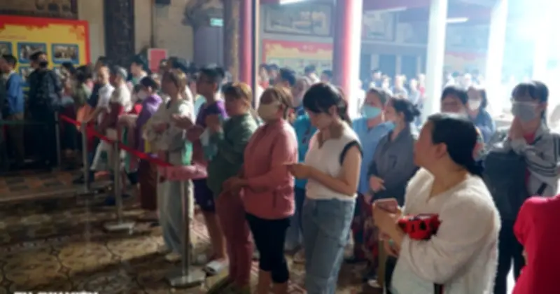 Ngay từ 7 giờ sáng, không khí tại Hội quán Tuệ Thành, thường được biết đến với tên gọi chùa Bà Thiên Hậu, đã trở nên nhộn nhịp khi hàng ngàn người dân từ khắp nơi đổ về để chờ đợi giờ xin ấn. Bên trong khuôn viên chùa, mọi người xếp thành nhiều hàng dài ngay ngắn, trên tay cầm những chiếc khăn và chấp tay khấn nguyện trong sự trang nghiêm.