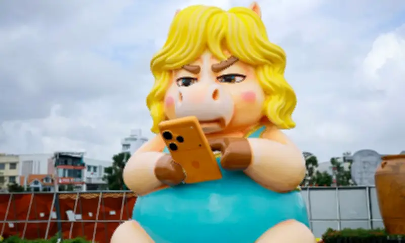 Trong cụm tiểu cảnh, linh vật ngựa "mặt cọc" cầm điện thoại thông minh với tạo hình tròn trịa và mái tóc vàng xoăn đã gây ấn tượng mạnh. Nhiều người bình luận rằng chi tiết này phản ánh đời sống hiện đại, bắt nhịp xu hướng công nghệ.