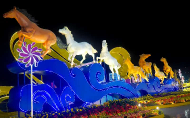 Đại cảnh nổi bật nhất tại khu vực này chính là hình ảnh đàn ngựa phi nước đại, biểu trưng cho năm Ngọ. Những chú ngựa được tạo hình mạnh mẽ với bờm tung gió, vó câu dồn dập, hướng thẳng về phía trước. Dưới ánh đèn nghệ thuật, đàn ngựa như bứt phá khỏi nền hoa xuân, tạo cảm giác chuyển động không ngừng. Đây không chỉ là linh vật của năm mới mà còn là ẩn dụ sâu sắc cho tinh thần quyết liệt, dám nghĩ dám làm, và dám bứt tốc của Đồng Tháp trên hành trình tiến về tương lai.
