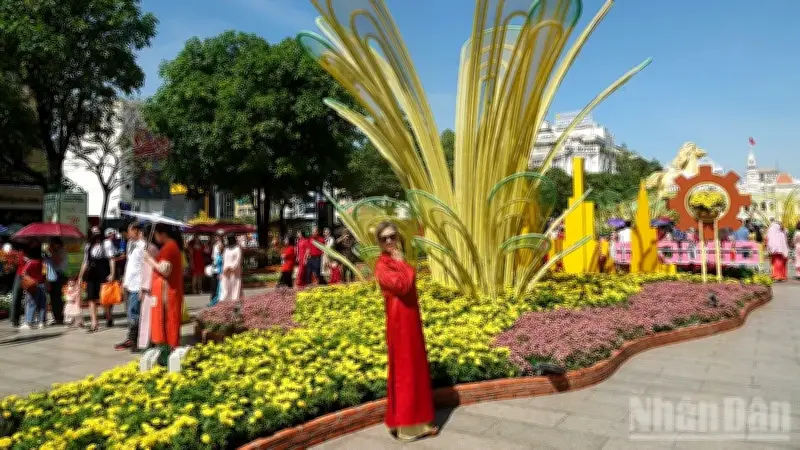 Sáng Mùng Một Tết Bính Ngọ 2026, không khí lễ hội tràn ngập khắp các con phố trung tâm Thành phố Hồ Chí Minh. Từ khu vực trước chợ Bến Thành đến Đường hoa Nguyễn Huệ, đông đảo người dân và du khách đổ về để chụp ảnh lưu niệm bên những cội mai, đào được trang trí rực rỡ, mang theo mong ước một năm mới đầy may mắn và tài lộc.