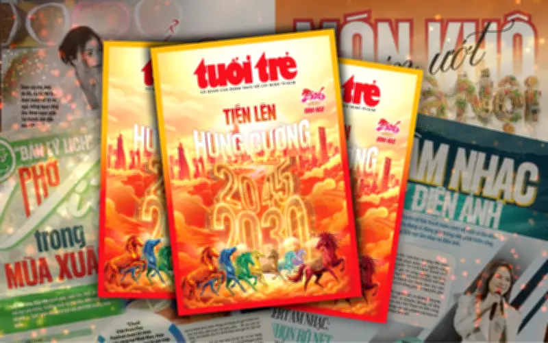 Giai phẩm Tuổi Trẻ Xuân Bính Ngọ 2026 không đơn thuần là một ấn phẩm mùa xuân, mà là một tác phẩm nghệ thuật mang thông điệp mạnh mẽ. Ngay từ trang bìa, ấn phẩm đã tạo ấn tượng với hình ảnh đàn ngựa Bính Ngọ được tạo hình như những khối đa diện rực rỡ, phi nước đại xuyên qua các tòa nhà chọc trời của tương lai năm 2030 và 2045. Những gam màu nóng đan cài vào nhau như thớ cơ căng lên, báo hiệu một năm của tốc độ và sự bứt phá vươn lên.