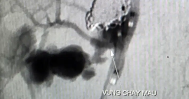 Trước nguy cơ bệnh nhân mất máu ồ ạt, các bác sĩ quyết định thực hiện chụp và can thiệp cầm máu dưới mạch số hóa xóa nền (DSA). Kết quả ghi nhận ổ giả phình động mạch cảnh trong phải đoạn cổ, dưới nền sọ, với kích thước 4,2 x 4,8 mm, cổ túi phình rộng và đang chảy máu tích cực.
