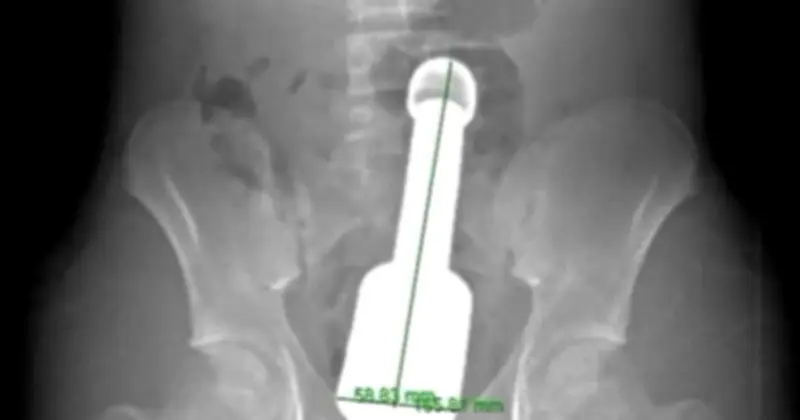 Hình ảnh y tế cho thấy chiếc chày kim loại có chiều dài lên tới 18 cm và đường kính 6 cm, một kích thước vượt quá giới hạn thông thường đối với cơ thể của một thiếu niên. Dị vật này không chỉ to mà còn rất nặng, đồng thời tạo ra hiệu ứng chân không phía trên đỉnh, khiến nó bị hút chặt vào lòng ruột, làm tăng nguy cơ biến chứng nghiêm trọng nếu xử trí không cẩn thận.
