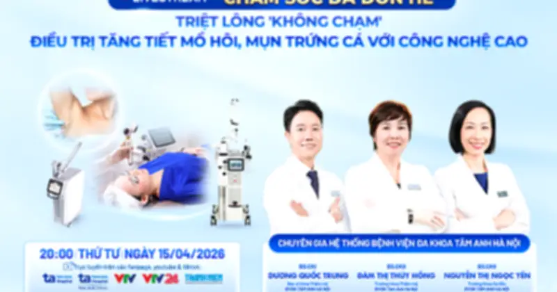 Vào lúc 20 giờ tối thứ Tư, ngày 15 tháng 4 năm 2026, các chuyên gia hàng đầu từ khoa Da liễu và Thẩm mỹ da của Bệnh viện Đa khoa Tâm Anh Hà Nội sẽ chia sẻ những giải pháp tiên tiến nhằm giải quyết các vấn đề "đau đầu" thường gặp trong mùa hè. Chương trình tập trung vào hai phương pháp nổi bật: triệt lông "không chạm" và điều trị tăng tiết mồ hôi hiệu quả, mang đến sự thoải mái và tự tin cho người dân.