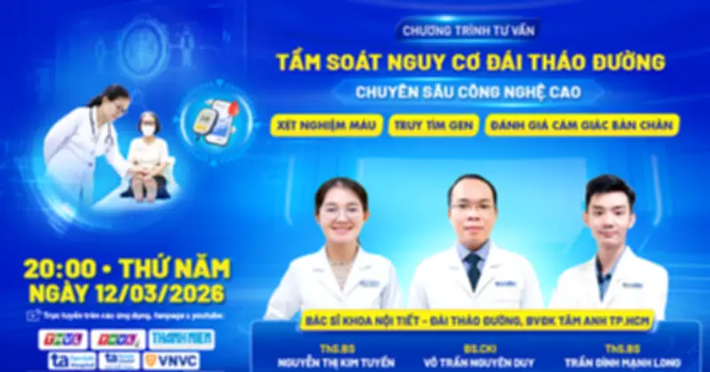 Vào lúc 20 giờ thứ năm ngày 12 tháng 3 năm 2026, Bệnh viện Đa khoa Tâm Anh TP.HCM sẽ tổ chức một chương trình tư vấn trực tuyến đặc biệt với chủ đề "Tầm soát nguy cơ đái tháo đường chuyên sâu công nghệ cao: Xét nghiệm máu - Truy tìm gien - Đánh giá cảm giác bàn chân". Sự kiện này nhằm cung cấp cho cộng đồng những thông tin y tế bổ ích và cập nhật về các phương pháp hiện đại trong phòng ngừa và quản lý bệnh đái tháo đường.
