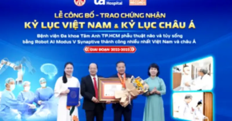 Ngày 26.2, Bệnh viện đa khoa Tâm Anh TP.HCM đã chính thức được trao chứng nhận xác lập kỷ lục Việt Nam và châu Á với số lượng ca mổ não và tủy sống bằng Robot AI Modus V Synaptive thành công nhiều nhất. Với 208 ca trong giai đoạn 2023 - 2025, thành tựu này không chỉ là minh chứng cho sự tiến bộ vượt bậc trong ứng dụng công nghệ y tế mà còn khẳng định vị thế tiên phong của Tâm Anh, mở ra hướng đi mới cho ngành y tế Việt Nam.