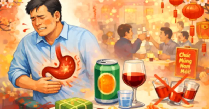 Dịp nghỉ Tết Nguyên đán thường gắn liền với những bữa tiệc tất niên, tân niên sum vầy, nơi mâm cỗ truyền thống đầy ắp bánh chưng, giò chả, thịt mỡ và không thể thiếu rượu bia. Tuy nhiên, đối với những người đang mắc bệnh viêm loét dạ dày, chỉ một chén rượu quá đà cũng có thể biến kỳ nghỉ Tết vui vẻ thành chuỗi ngày "khổ sở" với những cơn đau dai dẳng.