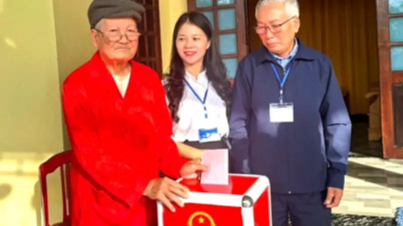 Tại khu vực bỏ phiếu số 15, thôn Kim Nại, xã Trường Ninh, tỉnh Quảng Trị, cụ ông Trần Công Tha đã trở thành tâm điểm chú ý với 103 tuổi đời và hơn 70 năm tuổi Đảng. Cụ là cử tri cao tuổi nhất trong danh sách cử tri của khu vực này, thể hiện sự gắn bó lâu dài với công cuộc xây dựng đất nước.