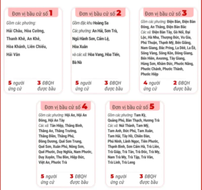 - Đơn vị bầu cử số 5: Bao gồm huyện đảo Hoàng Sa (theo quy định của pháp luật), thể hiện chủ quyền biển đảo thiêng liêng của Tổ quốc.