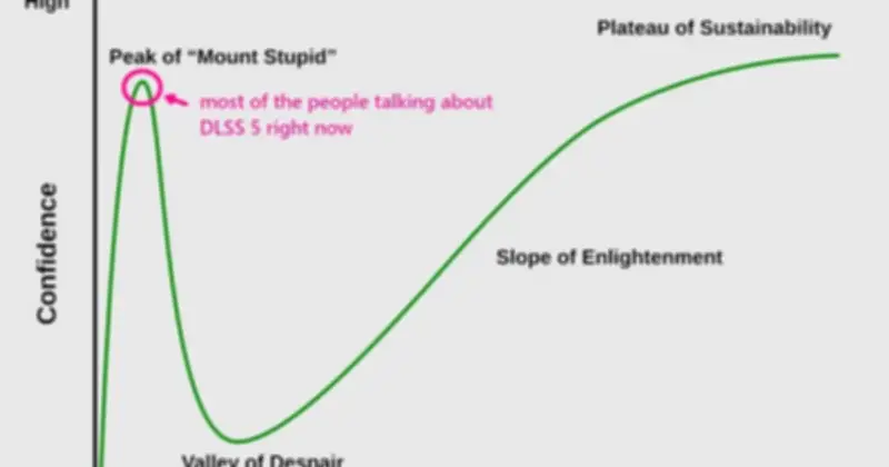 Avasilcutei còn chia sẻ biểu đồ hiệu ứng Dunning–Kruger, ám chỉ nhiều người phản đối DLSS 5 đang ở 'đỉnh núi ngu ngốc', tự tin tuyệt đối nhưng lại thiếu kiến thức nền tảng về công nghệ này. Theo ông, phần lớn những người chỉ trích đã dừng lại ở mức độ rất hời hợt khi biết đến yếu tố AI mà không hiểu sâu về cách thức hoạt động của DLSS 5.