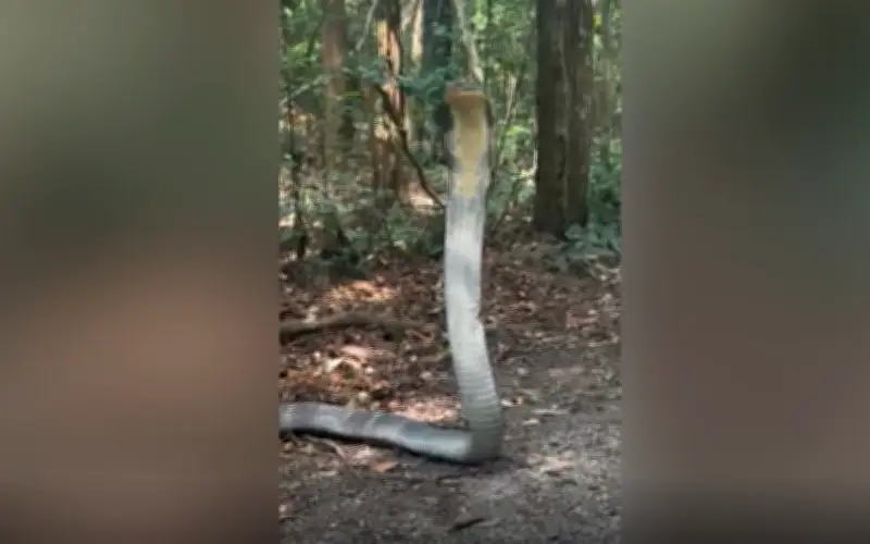 Ngay lập tức, Julia vội vã chạy xuống địa điểm được chỉ định và chứng kiến một cảnh tượng hiếm có: một con rắn hổ mang chúa khổng lồ, với chiều dài ước tính 4 mét, đang dựng thẳng phần đầu một cách đầy uy hiếp. Cô đã dành khoảng 15 phút để quan sát con vật một cách kinh ngạc, trước khi nó từ từ trườn đi vào khu rừng.
