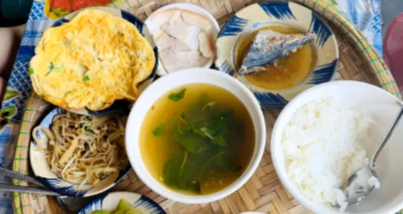 Mâm cơm bao gồm các món ăn đa dạng như cơm trắng, canh rau, thịt kho, cá chiên, rau xào, trứng và một món đặc sản địa phương. Du khách chia sẻ rằng họ không ngờ có thể thưởng thức một bữa ăn đầy đủ dinh dưỡng với mức giá quá rẻ như vậy. Chất lượng món ăn được đánh giá cao, tươi ngon và đậm đà hương vị truyền thống.