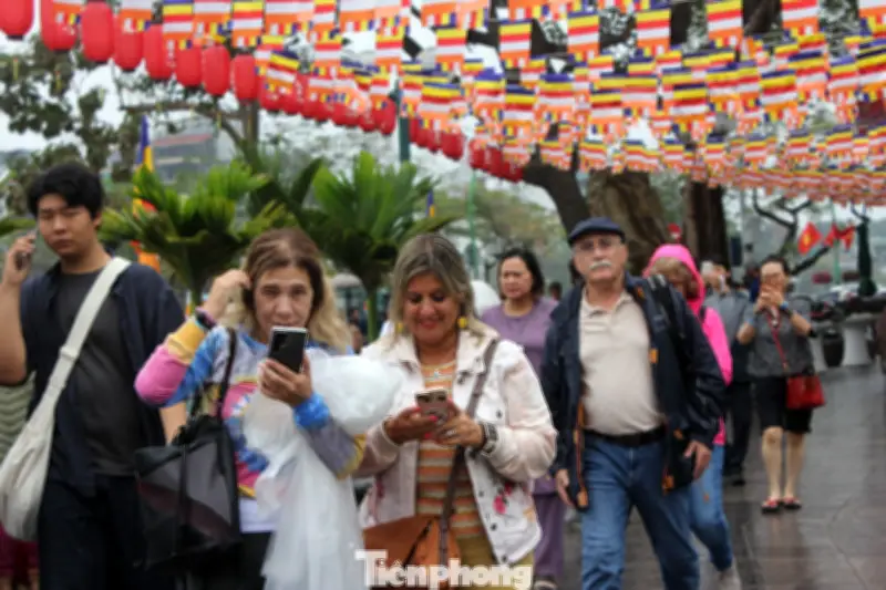 Nhiều người phải đội lễ lên đầu, chậm rãi len qua biển người để vào bên trong thắp hương. Cách đó không xa, chùa Trấn Quốc cũng đông kín du khách trong và ngoài nước. Nhiều đoàn khách quốc tế tranh thủ ghé thăm ngôi chùa cổ ven Hồ Tây để vãn cảnh, tìm hiểu văn hóa tín ngưỡng Việt Nam.