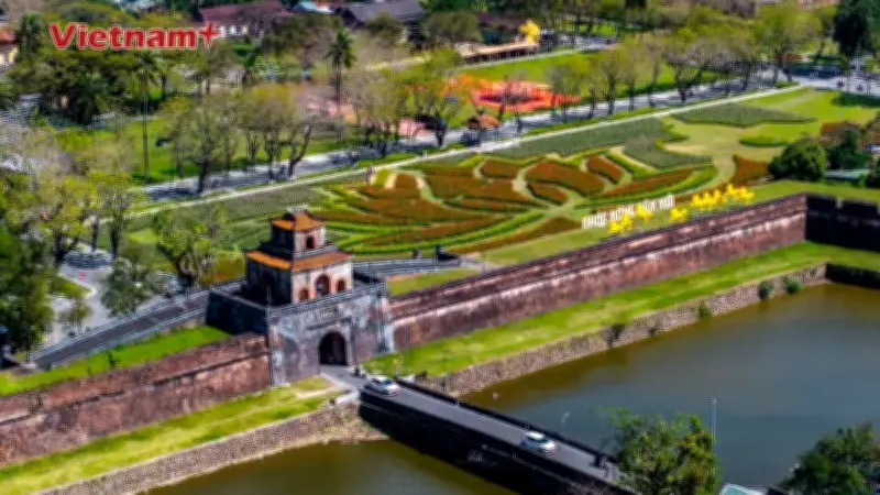 Trên diện tích gần 10.000 mét vuông tại sân Hàm Nghi, Trung tâm Công viên Cây xanh Huế đã bố trí hơn 50.000 chậu hoa với sự kết hợp chủ đạo giữa hoa pháo và hoa bướm. Những chậu hoa này được sắp đặt một cách công phu và tinh tế, tạo thành hình đóa sen nở rộ giữa không gian cổ kính của kinh thành Huế. Sự hài hòa giữa màu sắc rực rỡ và kiến trúc truyền thống đã mang đến một trải nghiệm thị giác độc đáo, làm say lòng bất kỳ ai có dịp ghé thăm.