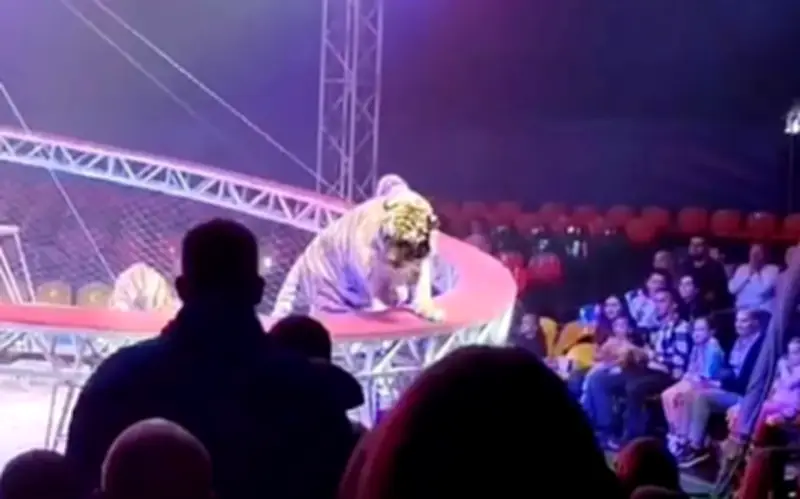 Một sự cố kinh hoàng đã xảy ra tại rạp xiếc Dovgaluk ở thành phố Rostov-on-Don, miền nam nước Nga, vào ngày 19/4, khi ba con hổ đang biểu diễn thì tấm lưới bảo vệ bất ngờ rơi xuống đất. Đoạn clip ghi lại cảnh tượng này cho thấy, dù lưới được kéo lên gần như ngay lập tức, nhưng một con hổ nhanh trí đã trèo ra ngoài và lao thẳng về phía khán giả, gây ra sự hỗn loạn tột độ.
