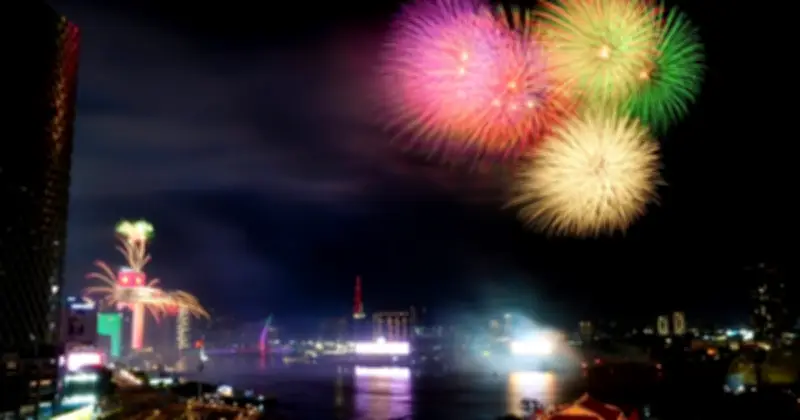 Đúng thời khắc pháo hoa bắt đầu, bầu trời thành phố rực sáng với những chùm pháo nhiều màu sắc, liên tục tỏa sáng, phản chiếu xuống mặt nước tạo nên khung cảnh lung linh, ấn tượng.