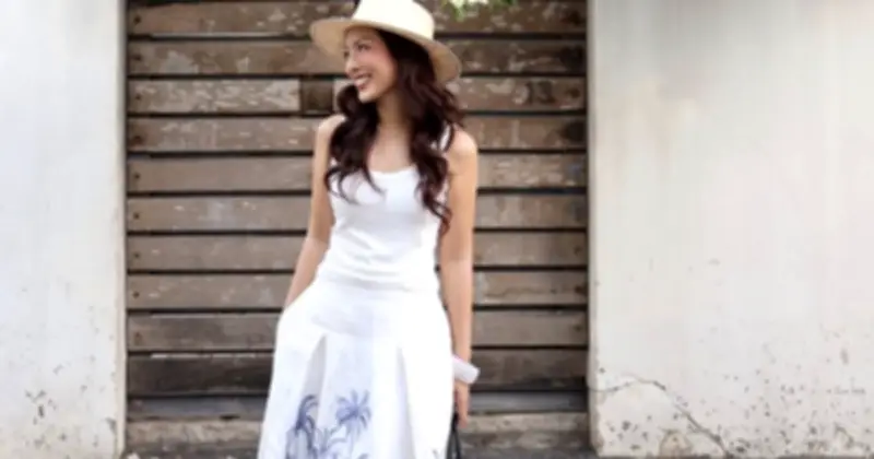 Chân váy dài in họa tiết nền trắng phối tank top trắng, dép xỏ ngón và mũ rộng vành mang đến góc nhìn giàu năng lượng và sự tươi trẻ. Tông màu sáng của trang phục kết hợp cùng loạt phụ kiện hè đem đến sự đồng điệu trong phong cách thời trang.