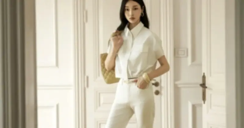 Ngoài ra, phong cách tối giản nhưng đầy tinh tế cũng được thể hiện qua set đồ áo sơ mi trắng ngắn tay dáng suông kết hợp cùng quần ống loe cạp cao màu kem. Điểm nhấn nhẹ nhàng đến từ chiếc thắt lưng mảnh và đôi giày cao gót quai thanh thoát, phù hợp cho những dịp cần sự chỉn chu mà vẫn giữ được vẻ sang trọng đặc trưng.