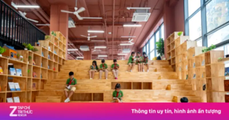 Thư viện rộng 900 m2 được chia thành hai tầng: tầng một là "thiên đường" sách mở để học sinh tự do khám phá, trong khi tầng hai là "ốc đảo" yên tĩnh cho các tiết học chủ đề. Khu vực kệ bậc thang là điểm nhấn, nơi học sinh có thể thư giãn và đọc sách.