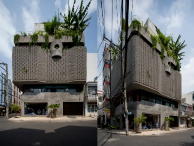 Với mặt tiền được tạo nên từ bê tông thô mộc, kết hợp khéo léo với những lớp kính trong suốt và tổ gạch đan xen, công trình kiến trúc này nổi bật như một tác phẩm nghệ thuật giữa phố thị. Sự kết hợp này không chỉ tạo nên vẻ ngoài khỏe khoắn, hiện đại mà còn khiến người đi đường không thể rời mắt, luôn ánh lên vẻ hấp dẫn xuyên suốt cả ngày lẫn đêm.