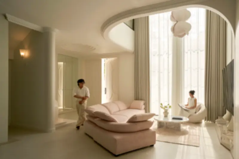 Không gian nội thất bên trong được chú trọng hạn chế tối đa các góc cạnh, thay vào đó là ưu tiên những đường cong uyển chuyển và các bề mặt được bo tròn cẩn thận. Các mảng tường, trần nhà và đồ nội thất đều được xử lý một cách liền mạch, giảm thiểu các chi tiết thừa không cần thiết. Thiết kế thông tầng kết hợp với hệ cửa kính lớn không chỉ làm tăng khả năng lấy sáng tự nhiên và đối lưu không khí mà còn giúp các khu vực chức năng liên kết với nhau một cách trực quan hơn.