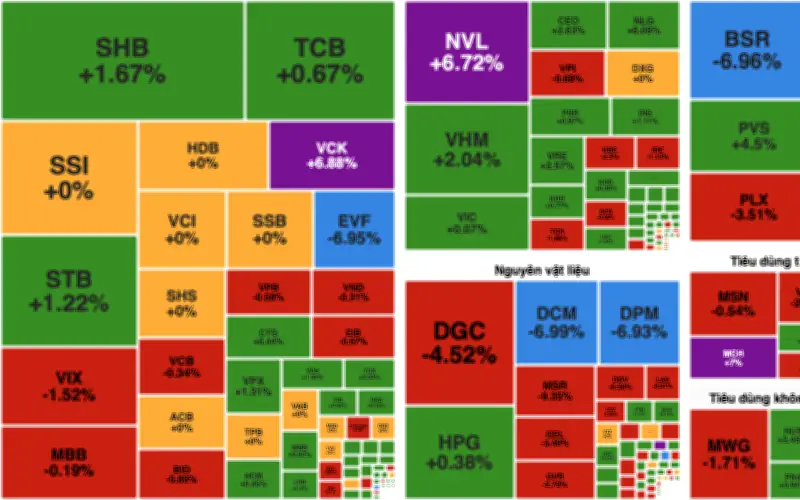 - Tài chính và Công nghiệp: Dần cân bằng trở lại vào cuối phiên. Một số cổ phiếu ghi nhận sắc xanh như SHB, TCB, STB, VCG, CII, VSC và CTD.