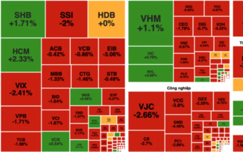 Xét theo nhóm ngành, sắc đỏ chiếm ưu thế ở hầu hết các lĩnh vực. Nhóm đầu tư công và xây dựng ghi nhận nhiều mã giảm sâu như CII, VCG, GMD, GEX, GEE, CTD và HHV. Nhóm thép tiếp tục chịu áp lực bán với HPG giảm 2,56%, NKG giảm 1,45% và HSG giảm 1%, cho thấy sự yếu kém trong ngành công nghiệp nặng.