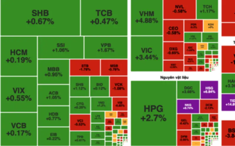 Nhóm chứng khoán tăng điểm nhẹ và tiếp tục phân hóa, phản ánh sự thận trọng chung của dòng tiền. Trong khi đó, nhóm vật liệu và xây dựng ghi nhận diễn biến tích cực hơn, với HPG tăng 2,7%, HSG và NKG tăng trần.