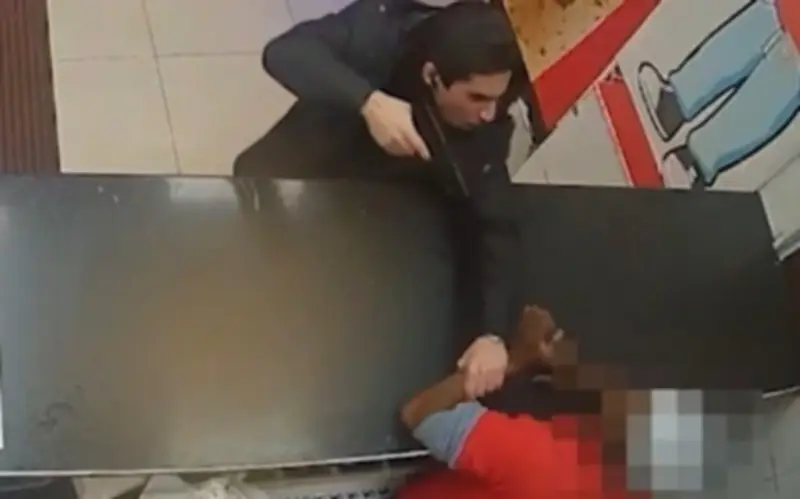 Khadir sau đó quay lại cửa hàng và hét vào mặt nhân viên: "Tôi đã yêu cầu 3 sốt chấm tỏi và 3 lọ sốt mayonnaise!". Hắn tiếp tục hét lên "Mở cửa!", nhảy lên quầy, rồi lên đạn một khẩu súng giả trông rất giống thật trước khi túm lấy cổ tay người nhân viên và chĩa súng vào đầu anh ta. Trong cuộc hành hung kéo dài hơn 2 phút, Khadir đe dọa: "Tao sẽ giết mày ngay bây giờ, mày điên à?", đồng thời tấn công nạn nhân nhiều lần.
