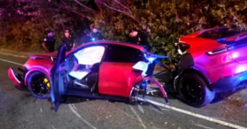 Chiếc Porsche sau cú đâm đã bị xé toạc thành hai phần, phần đầu xe tách rời khỏi thân sau. Đám cháy bùng phát ngay lập tức, ngọn lửa bốc cao cùng với khói đen cuồn cuộn, khiến hiện trường trở nên hỗn loạn.