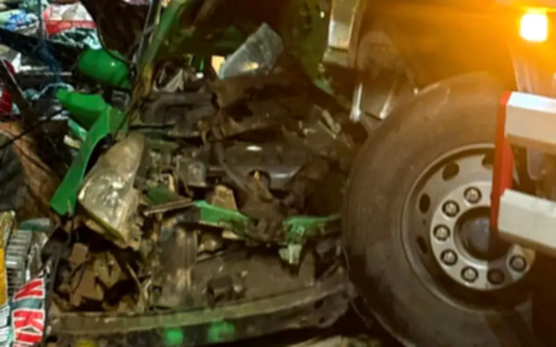 Cú tông mạnh đã khiến phần đầu của chiếc taxi bị vò nát hoàn toàn, bẹp rúm và dính chặt vào đầu xe tải, tạo nên cảnh tượng hỗn độn và đau lòng. Sau va chạm, cả hai phương tiện tiếp tục lao vào các quầy hàng được bày bán ven chợ trước khi dừng hẳn, gây thêm thiệt hại về tài sản và khiến hiện trường trở nên hỗn loạn hơn bao giờ hết.