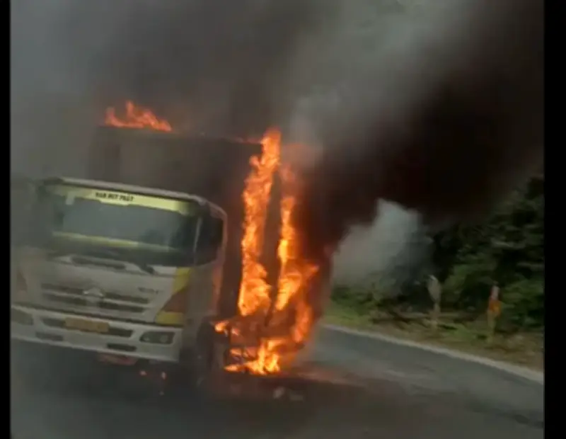 Chỉ trong vài phút ngắn ngủi, ngọn lửa bùng phát dữ dội, bao trùm toàn bộ chiếc xe tải. Cột khói đen khổng lồ bốc cao hàng chục mét, có thể nhìn thấy từ xa, tạo nên cảnh tượng hỗn loạn và nguy hiểm. Thời điểm xảy ra cháy, nhiều phương tiện giao thông vẫn đang lưu thông qua lại hai chiều trên con đèo này.