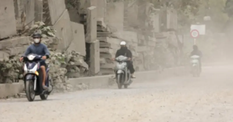 Từng đoàn xe công trình nối đuôi nhau chạy rầm rập, khiến các phương tiện phía sau hứng trọn lượng bụi phát tán. Dù đã đeo khẩu trang, nhiều người vẫn phải dùng tay che mặt khi di chuyển trong làn bụi mù. Cảnh tượng quen thuộc là người dân một tay lái xe máy, tay còn lại che mặt để tránh bụi. Những “lốc bụi” cuồn cuộn bốc cao khiến người đi đường phải nheo mắt, gây khó khăn trong việc quan sát và di chuyển.