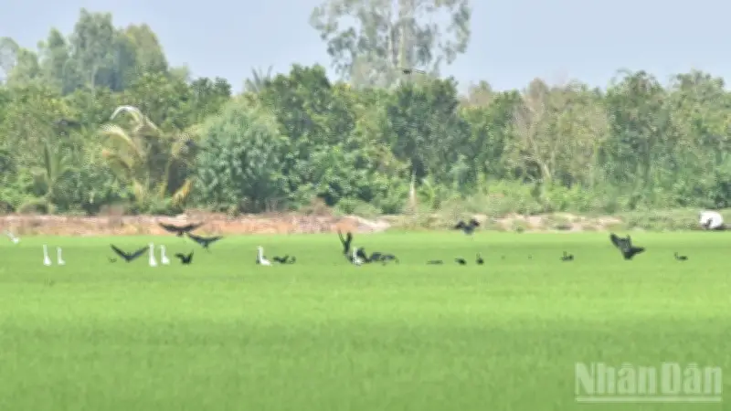 Trong những ngày gần đây, cánh đồng lúa hơn 20 ngày tuổi tại Ấp 5, xã Mỹ Thành, tỉnh Đồng Tháp đã trở thành điểm đến của hàng nghìn con chim, cò. Ông Nguyễn Văn Tâm, một người dân địa phương, chia sẻ: “Rất nhiều chim, cò về đáp xuống để ăn mồi. Một số loài rất lạ nên chúng tôi cũng không biết tên gì. Dù chúng có làm đổ ngã cây lúa, nhưng bà con không đuổi đi nơi khác”.