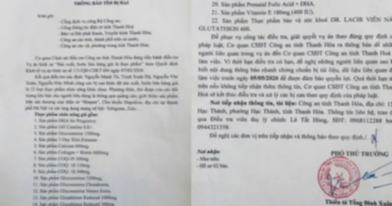 Ngày 3-4 vừa qua, Thiếu tá Tống Đình Xuân, Phó Thủ trưởng Cơ quan Cảnh sát điều tra Công an tỉnh Thanh Hóa, đã ký thông báo tìm bị hại trong vụ án "Sản xuất, buôn bán hàng giả là thực phẩm". Vụ án được khởi tố theo Quyết định ngày 7-2-2026, và trong quá trình điều tra, cơ quan chức năng đã thu giữ nhiều sản phẩm thực phẩm chức năng giả mạo.