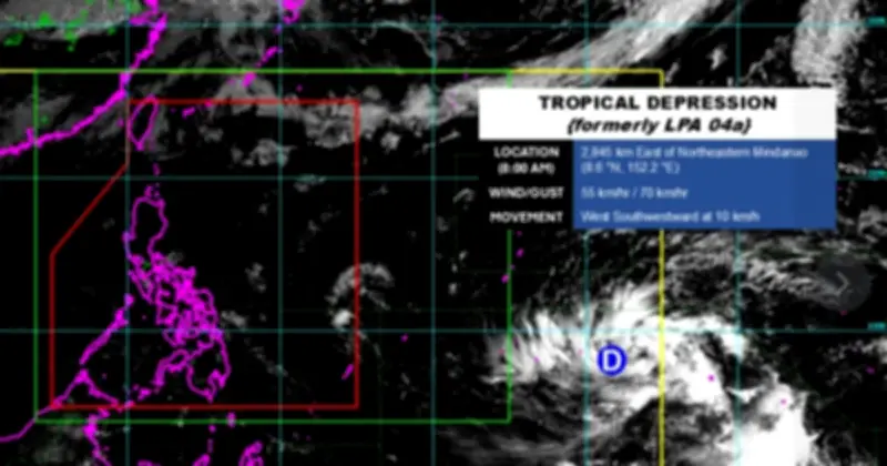 Tính đến 8:00 sáng ngày 09/04/2026, áp thấp nhiệt đới (trước đó được biết đến với mã hiệu LPA 04a) đang được Cục quản lý Thiên văn, Địa vật lý và Khí quyển Philippines (PAGASA) giám sát tích cực, nằm bên ngoài khu vực dự báo chính thức của quốc gia này. Vào lúc 2:00 sáng cùng ngày, tâm của hệ thống được xác định cách vùng Đông Bắc Mindanao khoảng 2.880 km về phía Đông, với sức gió mạnh nhất đạt 55 km/h và có thể giật lên tới 70 km/h. Hiện tại, áp thấp nhiệt đới đang di chuyển chậm theo hướng Tây, và dự kiến sẽ đi vào khu vực giám sát của Philippines (PAR) vào tuần tới, nơi nó sẽ được đặt tên địa phương là Caloy.