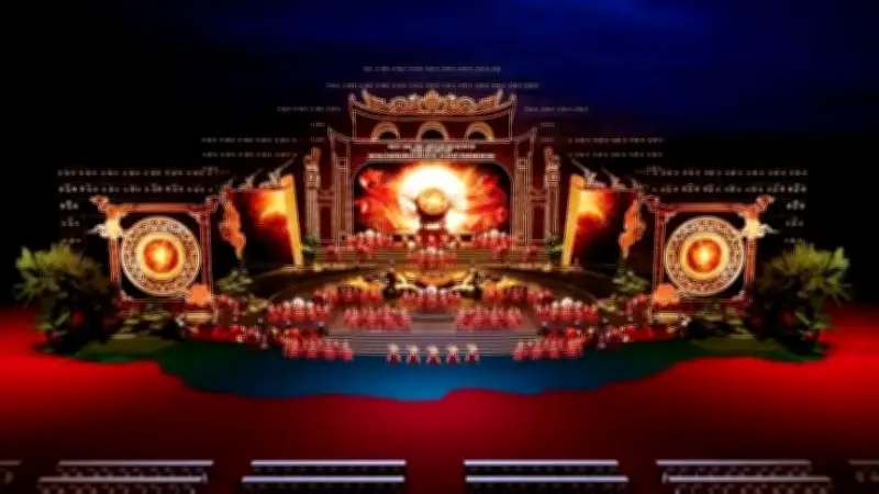 Theo Tổng đạo diễn Xuân Hồng, chương trình được dàn dựng trên diện tích biểu diễn khoảng hơn 2.000m2 với cấu trúc ba cấp và hai đường đi mở lên sân khấu. Khoảng trống giữa các cấp được khai thác như lối diễn ẩn hiện, tạo cảm giác huyền thoại và linh thiêng. Ê-kíp tập trung tối ưu hóa không gian sân khấu bằng cảnh mềm, cảnh cứng và chất liệu thật như cây cọ, tre, thay vì phụ thuộc vào công nghệ đắt đỏ, vừa đạt hiệu quả thị giác vừa giải quyết bài toán kinh phí.