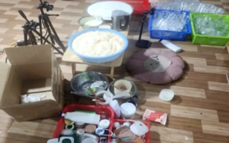 Cụ thể, cơ sở sử dụng các loại thau để chứa nguyên liệu sản xuất, với thành phần chính là bột gạo. Sau đó, các nguyên liệu này được phối trộn với nhiều loại hóa chất và mỹ phẩm khác được mua trôi nổi trên thị trường. Đáng chú ý, trong số đó có những sản phẩm có chữ nước ngoài, chủ yếu là từ Trung Quốc, nhưng không có nhãn phụ theo quy định của pháp luật Việt Nam.